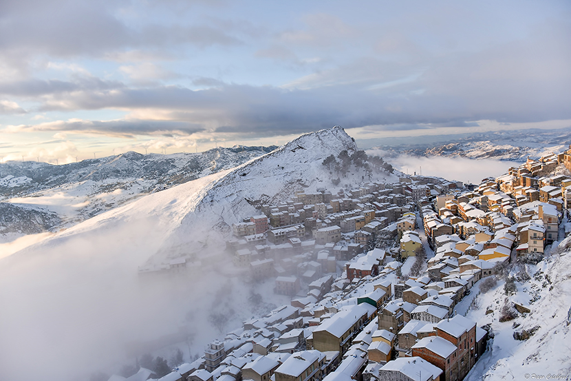 Tra le tante presentiamo questa che nostro parere contestualizza perfettamente la posizione geografica di Troina (EN) che affiora tra la nebbia e le montagne. La neve sui tetti ci fa comprendere il rigore dell’inverno mentre dalla disposizione delle case, emergere il calore che si può vivere nel paesino siciliano dopo una nevicata.